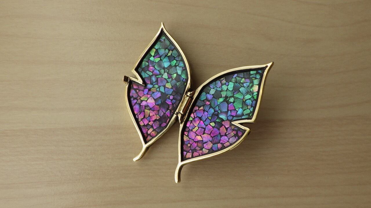 枯葉に擬態するコノハチョウ(木の葉蝶)をモチーフにしたブローチです。翅を閉じると木の葉のブローチとしてもお使い頂けます。