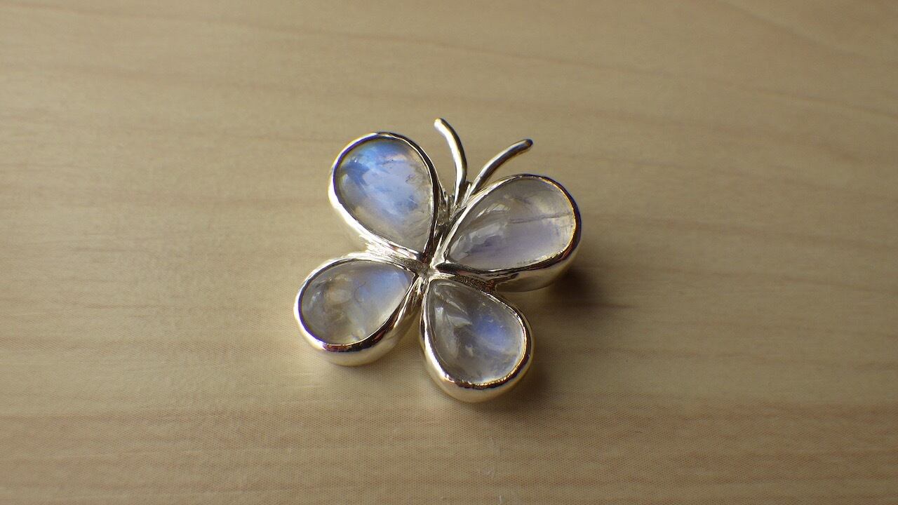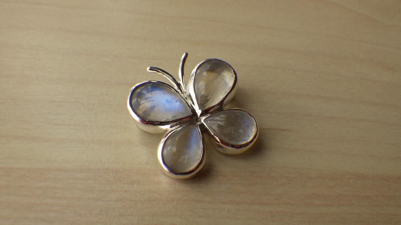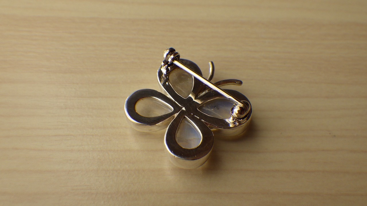 蝶をモチーフにしたブローチです。 蝶の翅はムーンストーンで出来ています。 【素材】 SV925 【長さ】 24mm
