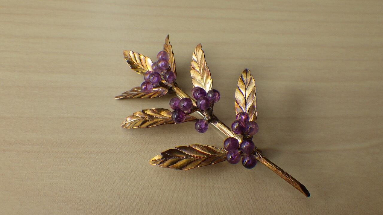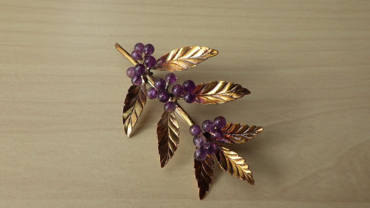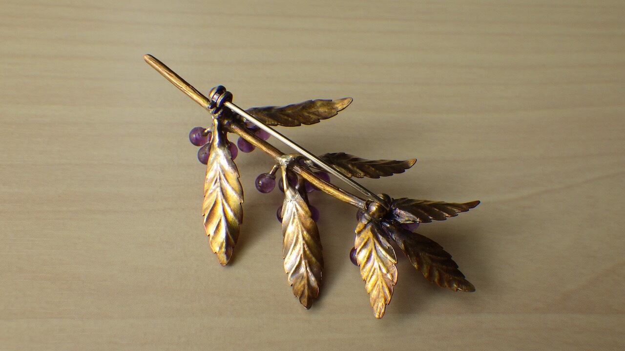 シソ科の落葉低木であるムラサキシキブをモチーフにしたブローチです。紫色の果実はアメシストで出来ています。 【素材】 真鍮 【長さ】 60mm