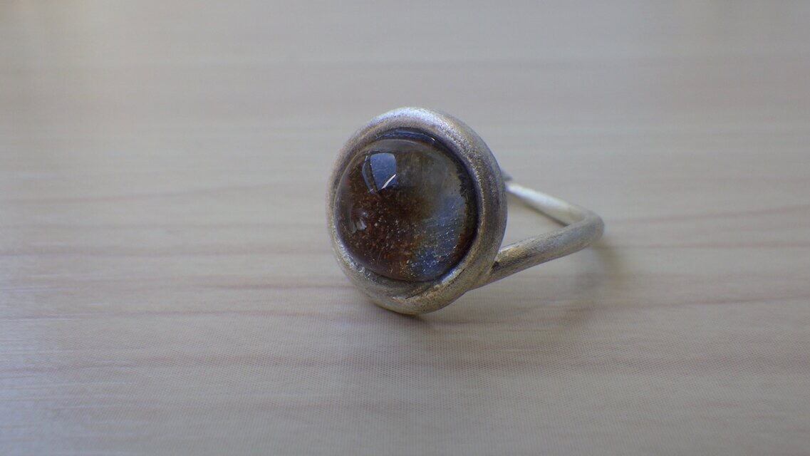 バイカラーのデュモルチェライトインクォーツに巻きつくウロボロス(尾を飲み込む蛇)をモチーフにした指輪です。