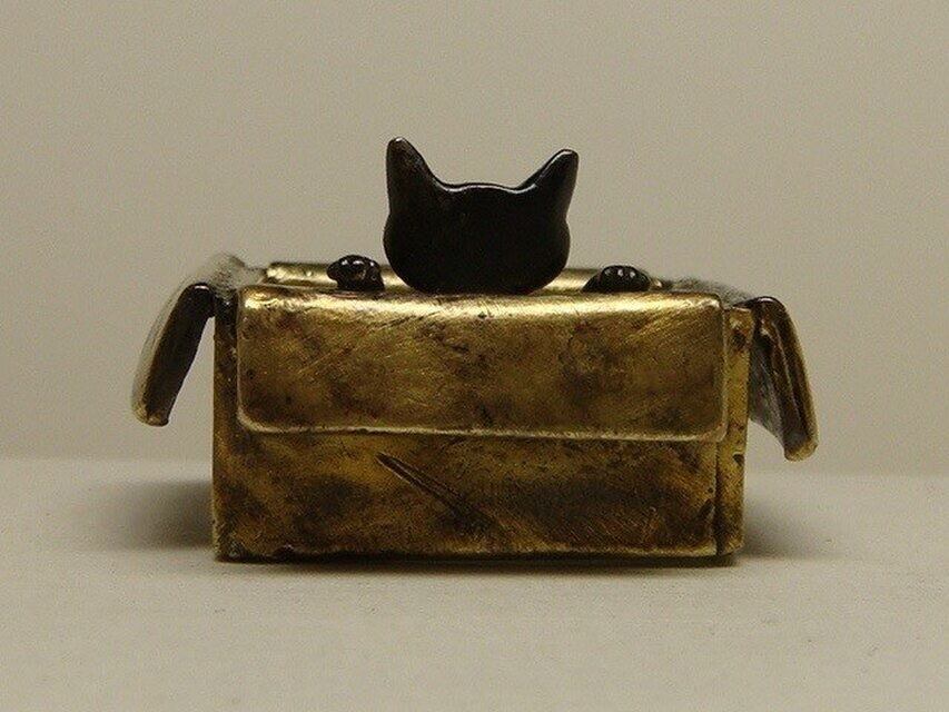 捨て猫をモチーフにした指環です。ダンボール箱から顔を覗かせている子猫は真鍮を燻すことで、黒猫のような感じに仕上げました。
