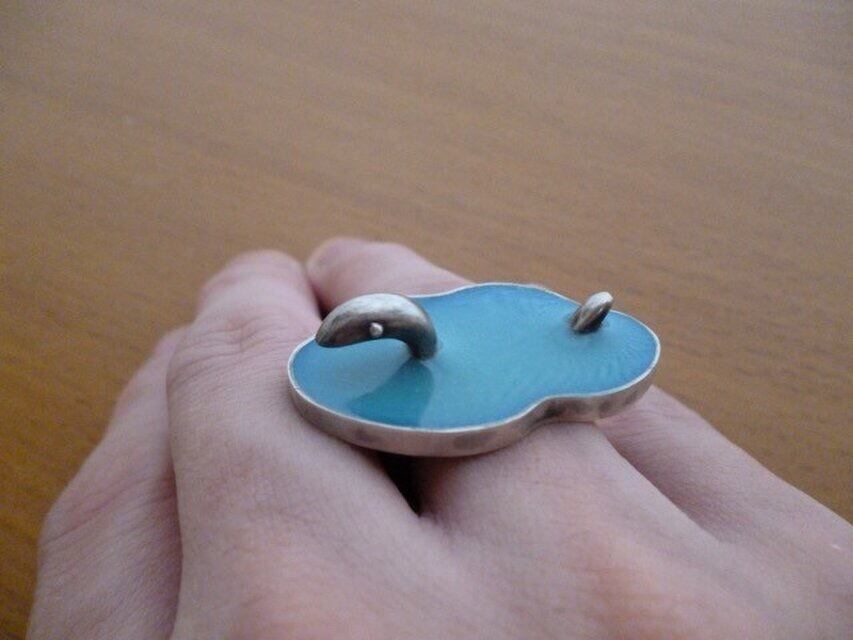 湖面から頭と尻尾を出している未確認生物「ネス湖のネッシー」をモチーフにした指輪です。湖はレジン(樹脂)で出来ています。